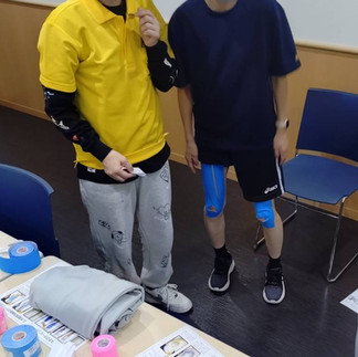 テーピングの引っ張る強さや巻かれた感覚の感想を伝え合い、参加できなかったチームメイトのために動画を撮影する様子も見られました。