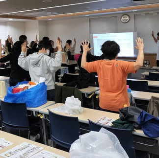 最初の30分はスライドを見ながら台東区柔道整復師会の救護活動の役割や『ビーチボール競技におけるケガの特徴』、『テーピングの座学』、そして『水分補給と食事のとり方』について学びました。